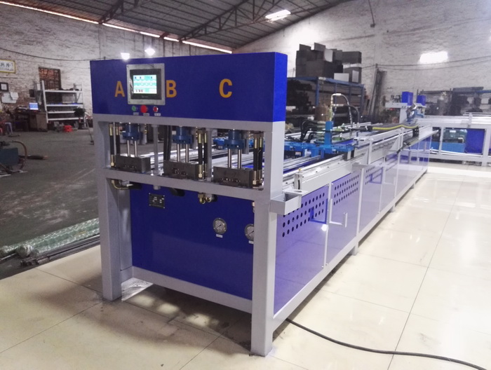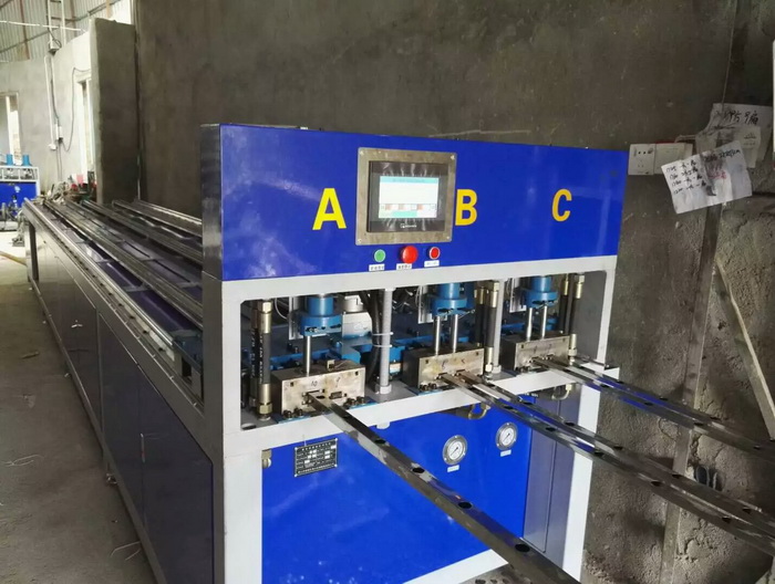 三工位數(shù)控全自動沖孔機,三工位同時工作,一次沖6支管,每個油缸可單獨控制沖全孔、半孔,大大提高不銹鋼防盜網(wǎng)沖孔效率,行業(yè)首創(chuàng),專利產(chǎn)品